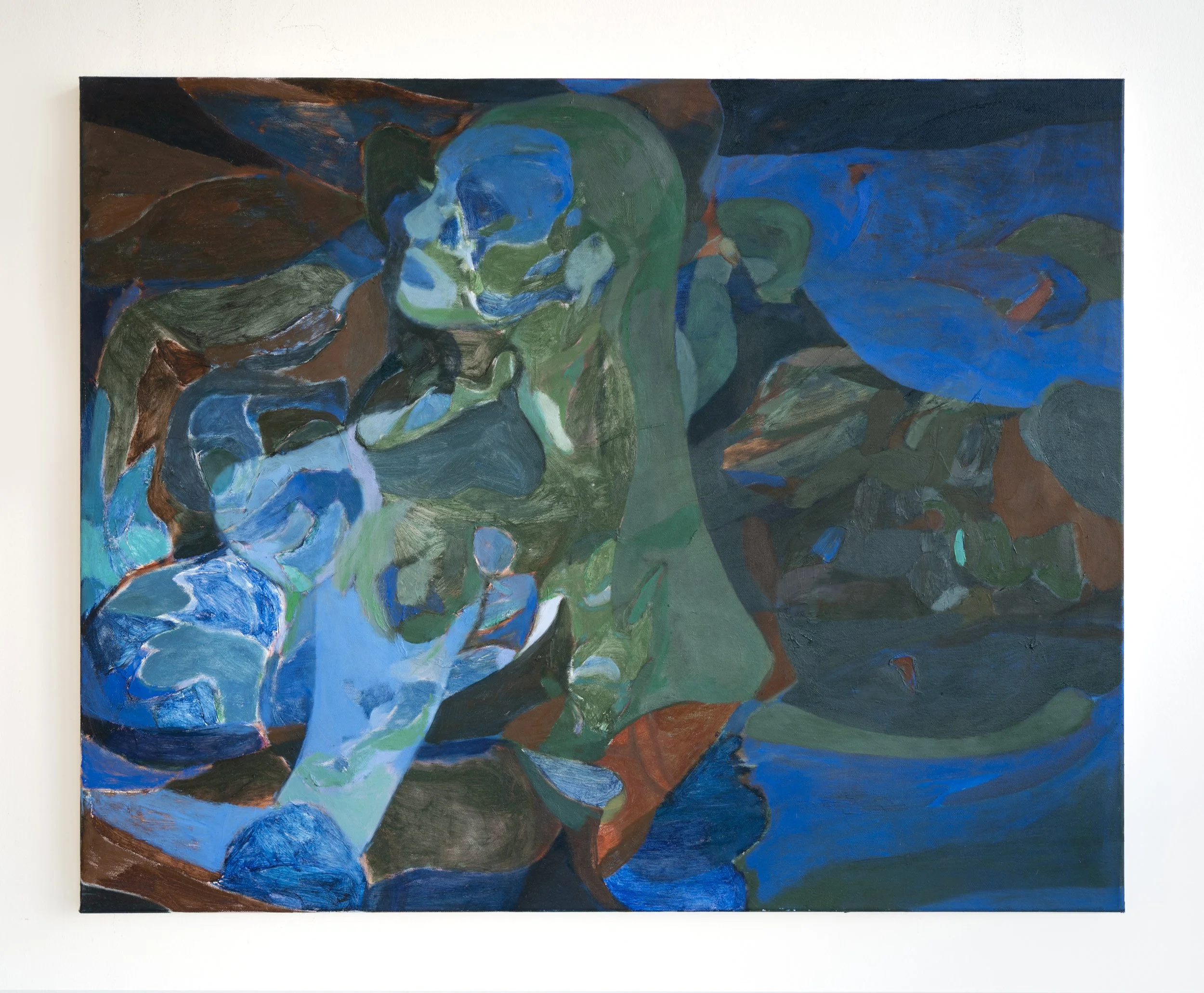Abstract painting with shades of blue, green, and brown, featuring curved and textured brushstrokes. Slide 1 Slide 1 (current slide) Slide 2 Slide 2 (current slide) SHALLOW GRAVE | Oil On Canvas | 80 x 60 cm | 2024