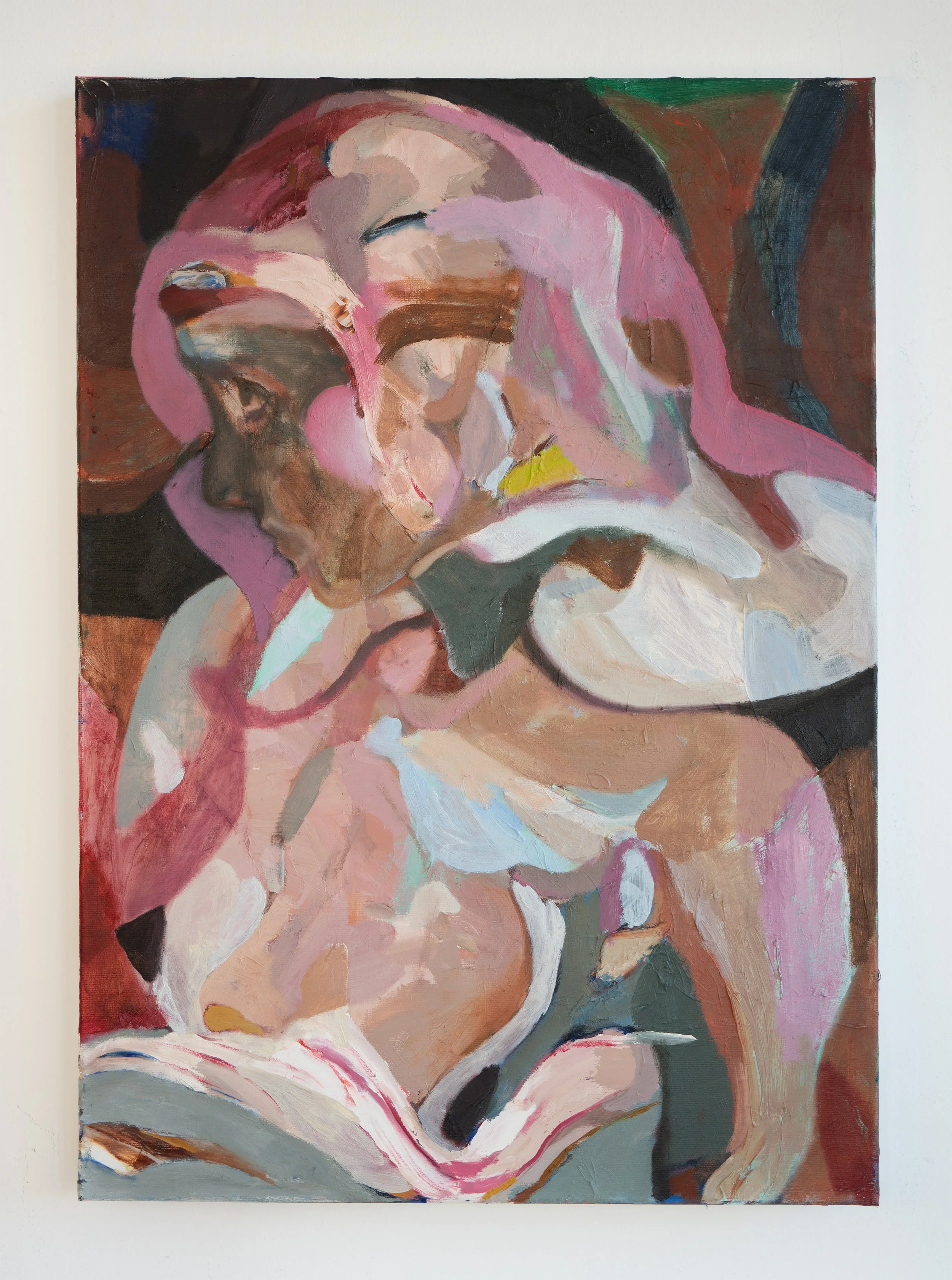 Abstract expressionist painting of a person's profile with pink and brown tones, using loose, bold brushstrokes. Slide 1 Slide 1 (current slide) Slide 2 Slide 2 (current slide) RENDER ME HAPPY | Acrylic and Oil On Cinen | 70 x 50 cm | 2024